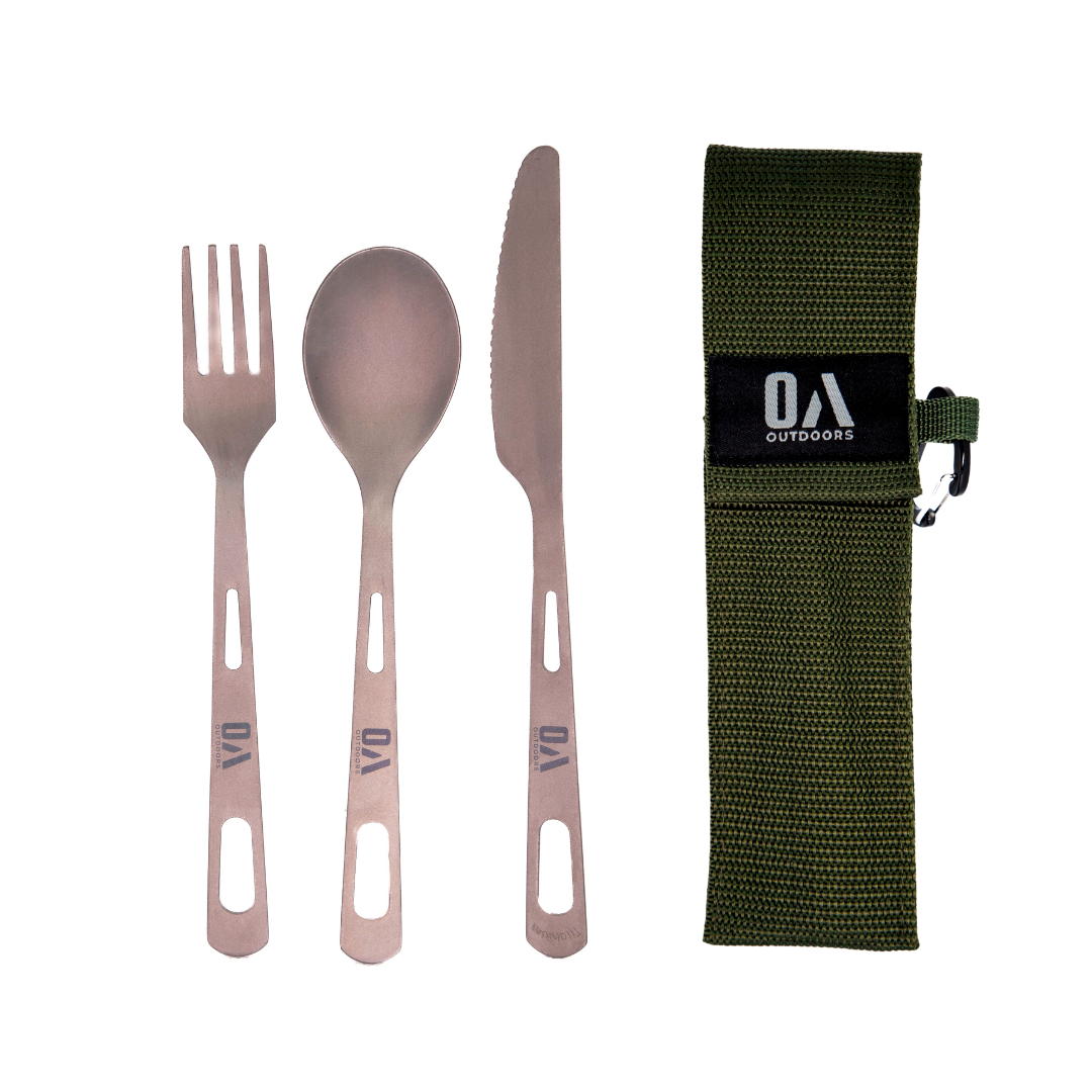 Este set de cubiertos de titanio es el compañero perfecto para tus aventuras al aire libre o para usarlo diariamente. Ligero y resistente incluye cuchara, tenedor y cuchillo, todo guardado en un práctico estuche con un clip que puedes llevarte contigo a donde vayas.